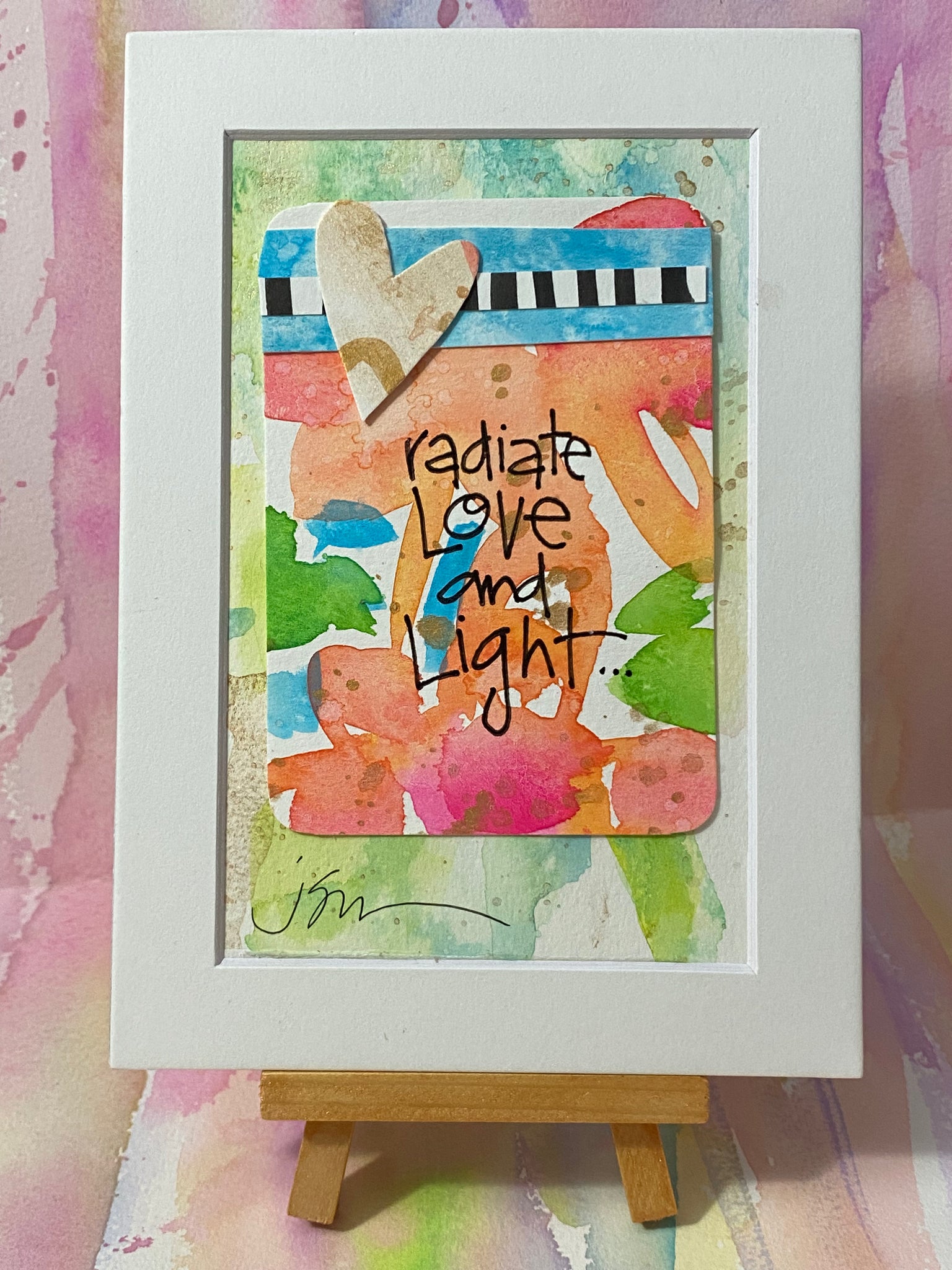 An original watercolor painting, hand lettered in a 5"x7" mat by artist Joanne Sharpe.  Multi-color watercolor painting, black glossy ink lettering with a dimensional collage painting art as focal point.  The small wooden easel and "Good Vibes" 3"x3" holographic sticker included in order.  Makes a wonderful inspirational gift, frameable.